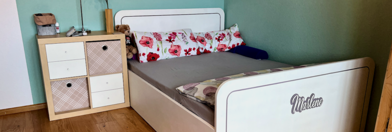 Meine Tochter wünschte sich seit längerem ein größeres Bett und nach einigen Überlegungen zum Design und zur Machart habe ich das Projekt nun umgesetzt. Das Ergebnis ist ein Bett mit klarem, minimialistischem Design, das dennoch einige etwas verspielte Elemente enthält und Akzente setzt.